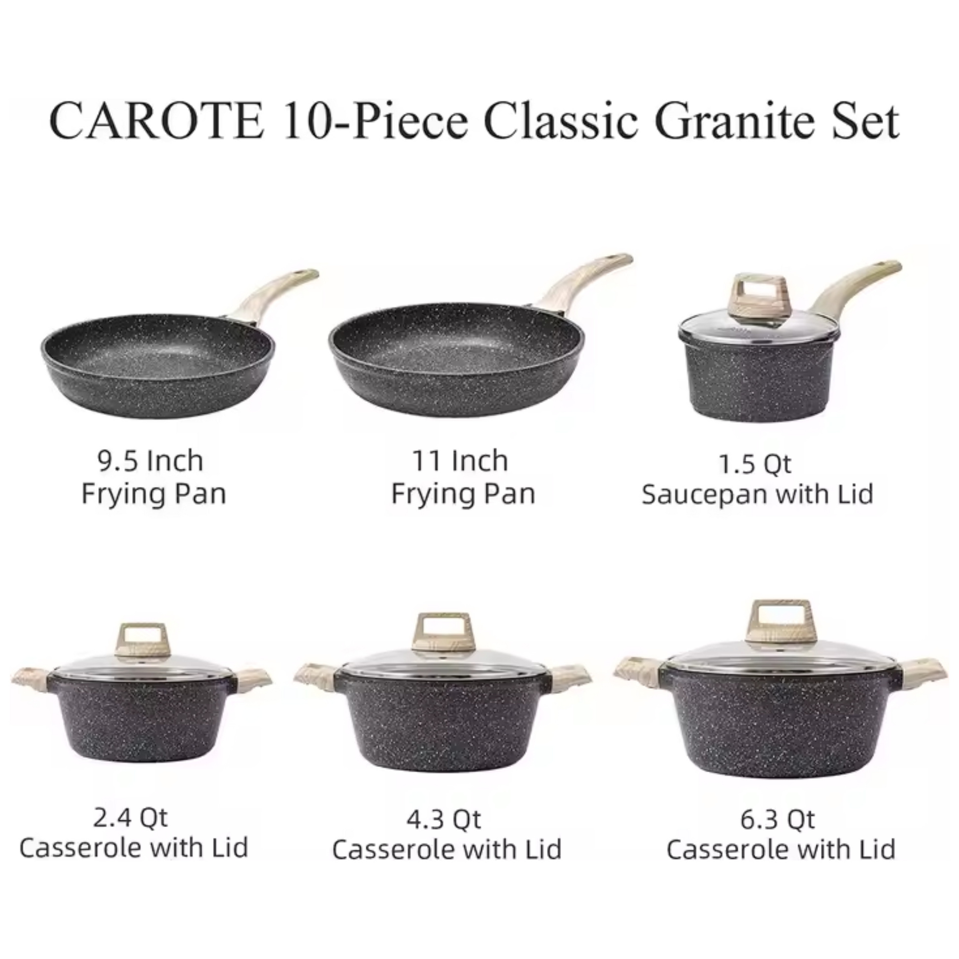 The StoneCore Non-Stick Cookware Series brings durability and healthy cooking to your kitchen. Designed with a toxin-free granite stone coating and crafted for performance, this 10-piece set is perfect for everyday use. The speckled black stone finish and faux-wood handles combine aesthetics with ergonomic function.